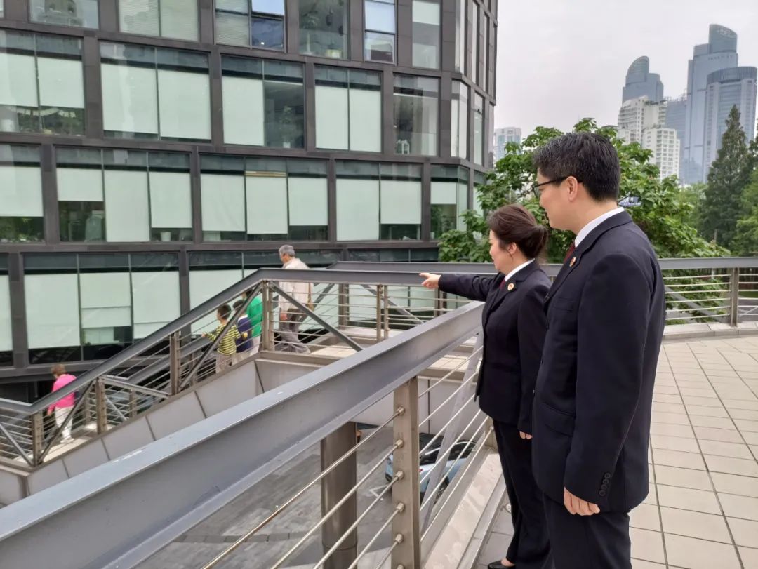 上海市徐汇区检察院检察官在宛平路肇家浜路天桥进行现场调查。